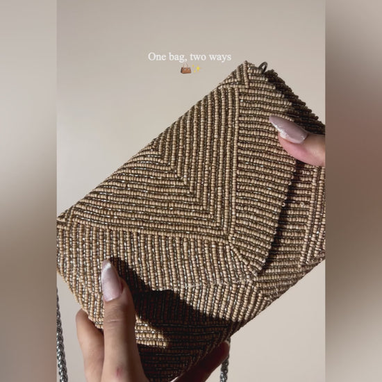 The Chevron Bag is a versatile piece featuring intricate beadwork in a chevron pattern. It comes with a sleek chain strap that lets you wear it crossbody or doubled up as a chic shoulder bag.